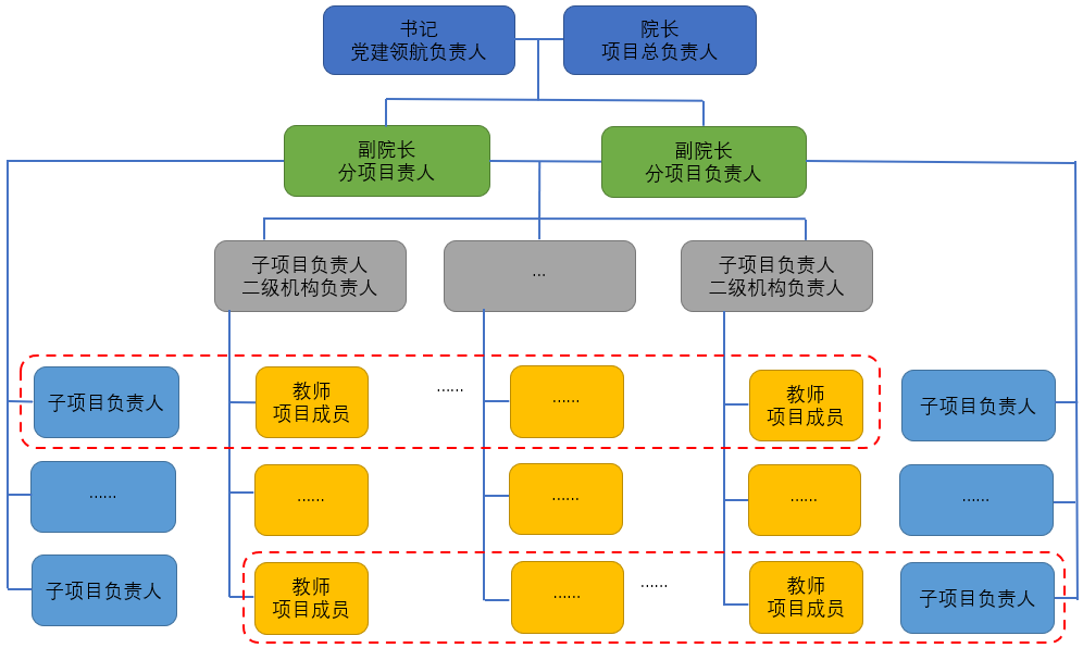 软件技术专业群“双高”建设实行项目制,按照现代项目管理理论,建立了一套复合型项目管理组织架构。软件学院院长任项目总负责人,全面把控建设内容和进度;学院党委书记为党建领航负责人,以党建标杆引领项目建设;两名副院长作为分项目负责人,直接分管、监测具体分项任务的建设和管理。学院二级机构负责人作为子项目负责人,带领该职能部门的教师完成具体分配的建设任务。为了进一步提升项目效率,灵活处理重要事项、协调资源,根据任务需求,在不同二级机构间建立横向项目小组,即项目小组成员跨越不同二级机构。横向项目小组设立子项目负责人,可以是院领导、二级机构负责人,也可以是其他教师,其直接对相应的分项目负责人负责。