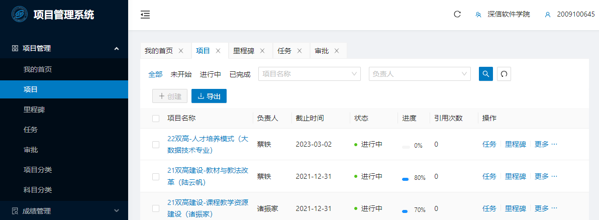 为了更好地明晰权责,落实任务负责制,并匹配任务与建设资金,学院打造了项目管理系统平台。通过该系统平台,把“双高”建设的“事、钱、批、监”紧密串联起来,高效推进项目建设和任务进度。“事”指的是具体的责任到人的建设任务,“钱”是执行该任务所配备的预算资金,“批”是对预算资金执行规范和进度的管理与审批,而“监”是对整个任务进度和预算执行进度的监测。通过系统管理,做到了专项资金使用必须附上确定的成果佐证,无对应产出成果不能进行报销。各级负责人充分发挥审核作用,层层把关,确保了各项目建设中的阶段性成果与目标对应,资金使用与预算对应,执行进度与计划安排对应。