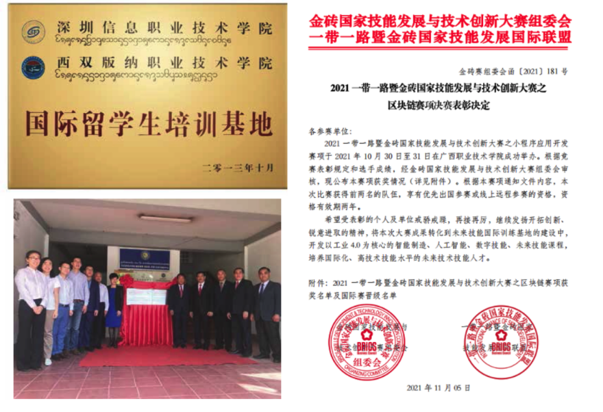 推广双元制项目合作模式,打造国际ICT学院,响应一带一路争创世界一流。与腾讯云合作开发微信小程序职业技能等级标准、云计算应用开发职业技能等级标准、云服务操作管理职业技能等级标准;2020年与腾讯云合作,主持制定了《软件技术专业》、《移动应用开发专业》国际版(英文)实训教学条件建设标准。以西双版纳国际留学生培养基地为桥梁,依托深圳信息职业技术学院软件学院与人工智能产业建设境外产业技术学院,向泰、越、老、柬、缅等一带一路国家开展教学标准的输出和共享。2021年度资助建设院级精品课程30门,其中16门精品课程对接联合国教科文组织开展国际网络视频课程建设,助力亚非发展中国家共克疫情,开展线上教学,获得良好国际办学声誉。同年,学校《国际中文+新一代信息技术教育实践与研究基地建设(2022-2023)》获教育部中外语合中心正式批准为国际中文教育创新资助项目,该基地具备面向粤港澳的职业技能公共实训基地的功能,其中,与腾讯云合作共建的云应用、微信小程序两项课程及教材成功入选。