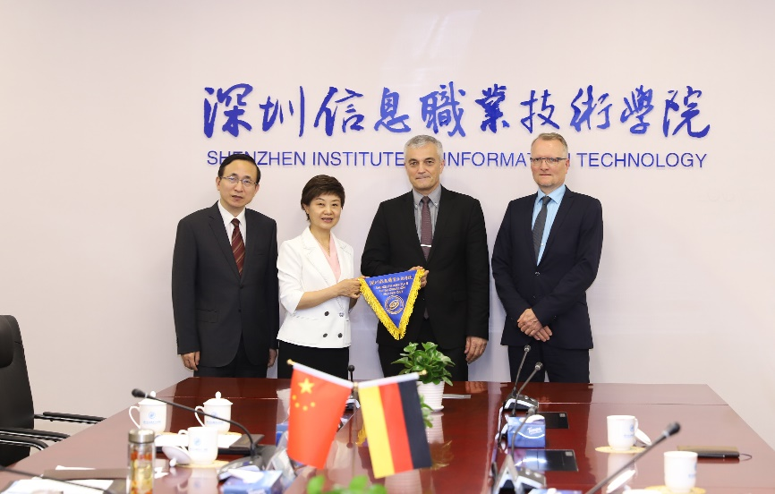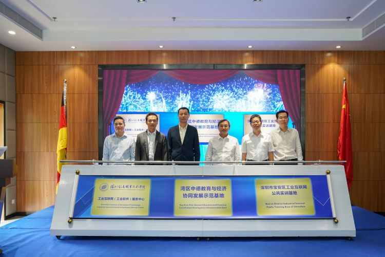 粤港澳大湾区中德教育与经济协同发展示范基地(简称湾区中德基地)由深圳信息职业技术学院联合德国史太白经济促进基金会(简称德国史太白)、德国乌尔姆TFU科技园、宝安区人民政府,四方共同建设。湾区中德基地于2019年6月在时任深圳市委王伟中书记,中国驻慕尼黑总领事张越,德国前副总理、经济部长菲利普•勒斯勒尔,时任深圳市委大湾区办主任聂新平等双边高层领导见证下,四方合作框架协议签订,开启了职业教育国际合作,从中外点对点合作走向“政、校、行、企、资”全链条合作的新模式。