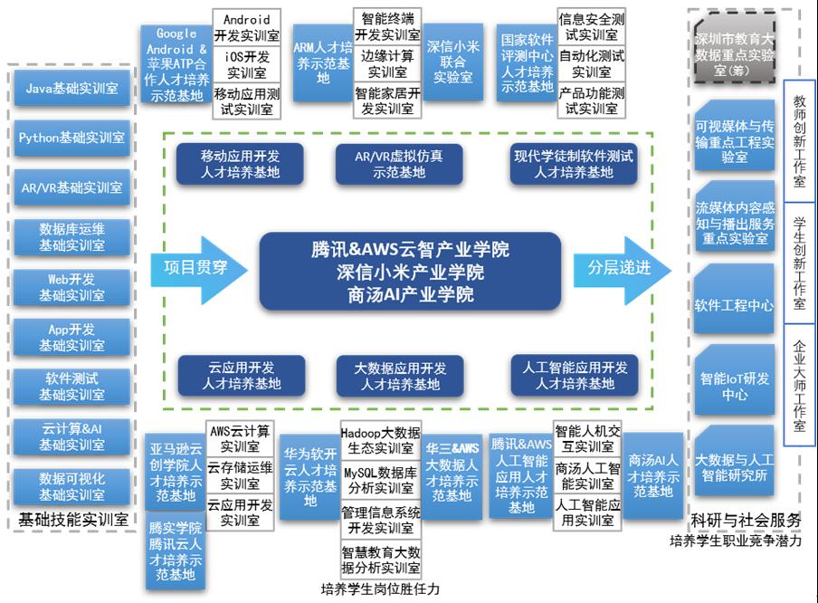 依托“教育部-AWS云创学院”,校企联合打造人才培养和技术服务高地,助力中小企业数字化转型升级。软件技术专业群依据“产教孪生”的理念推进校企协同育人,携手头部企业打造了腾讯&AWS云智产业学院、小米深信产业学院和商汤AI产业学院等3个特色产业学院及“深信云创中心”。根据数字技术发展趋势,聚焦创新链、产业链和数据链,解决“专精特新”企业的技术困境,为中小企业软件产品主动“上云”提供技术和智力支持,推动“专精特新”企业提高产业技术能力,助力产业更快更好发展。