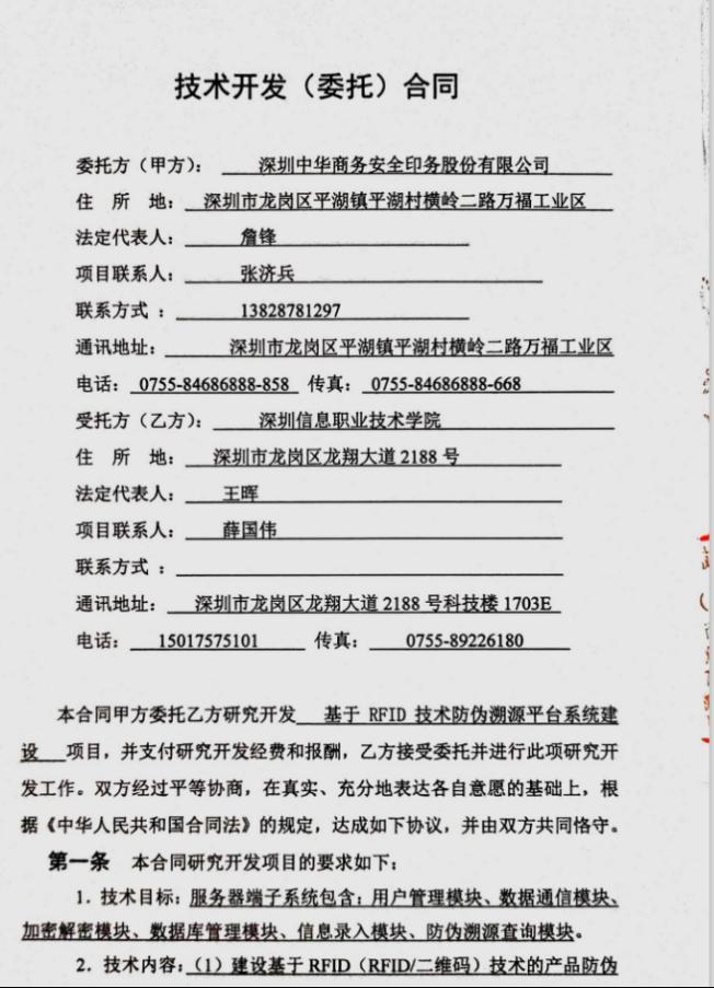 “云创学院”与地区企业开展科研合作,助力地区企业数字化转型。深圳中华商务安全印务股份有限公司是国内领先的印刷和出版企业,新经济、新技术快速发展对其传统业务带来挑战。“云创学院”教师团队与该公司开展合作,通过系列培训提升其科技人员新技术理论技术水平,通过联合技术攻关,助力其传统业务“上云”,将人工智能和区块链技术应用于其生产制造业务。