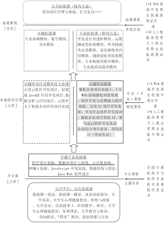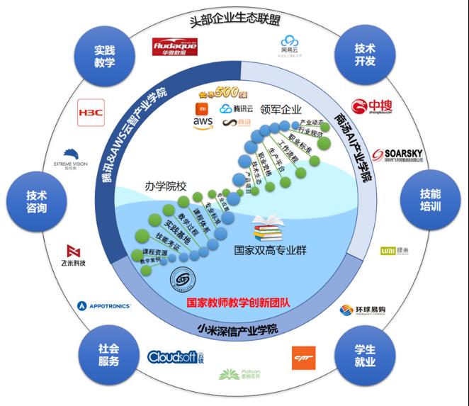 腾飞班培养模式由软件技术专业群与腾讯合作创新、合作实施,结合关键岗位人才定义,校企合作制定人才培养方案,依据行业岗位能力要求和腾讯云实战案例形成培训内容,通过向职业院校学生提供培训考核以及生态企业实习机会,形成高技能人才培养的生态闭环。将设备、技术、人力、项目等企业资源引入班级,提升专业的整体软硬件教学实力。加强学生基础理论和新技术学习的同时,每门理论课程均搭配实训学时,强化实践能力和操作技能的培养。腾飞班培养模式受到教育主管部门的肯定,入选教育部“提质培优,增值赋能”典型案例。