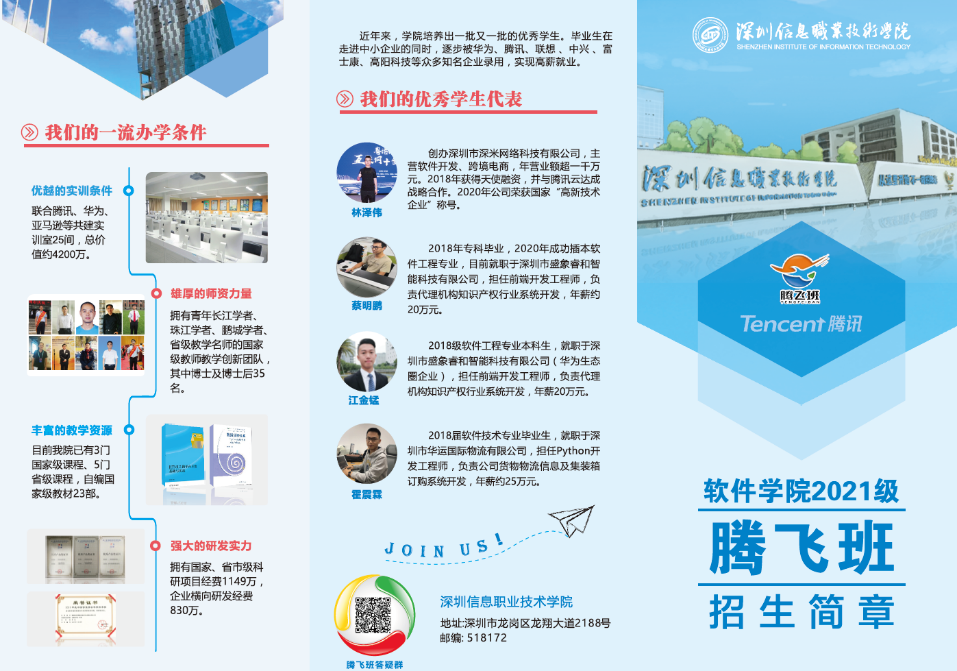 以“腾讯高等工程师学院”为依托,面向云开发和人工智能技术为代表的高端软件关键岗位,软件技术专业群组建卓越特色班“腾飞班”。专业群以产业学院为载体,探索“产教孪生”理念下的校企协同育人新模式,实施精细化人才培养策略,围绕人工智能、云计算、大数据等新技术内容,与腾讯等头部企业合作,开展“卓越班”培养计划,择优组建“腾飞班”对学生进行分层分类教学,实施“岗课赛证”融通的培养模式,打造专本硕衔接的课程体系,采用精英式小班教学,配以校企双导师,以科研和服务社会为动力,助力学生开展科技创新,成长为一专多能型高端技能人才,以国际化视野服务粤港澳大湾区产业发展。